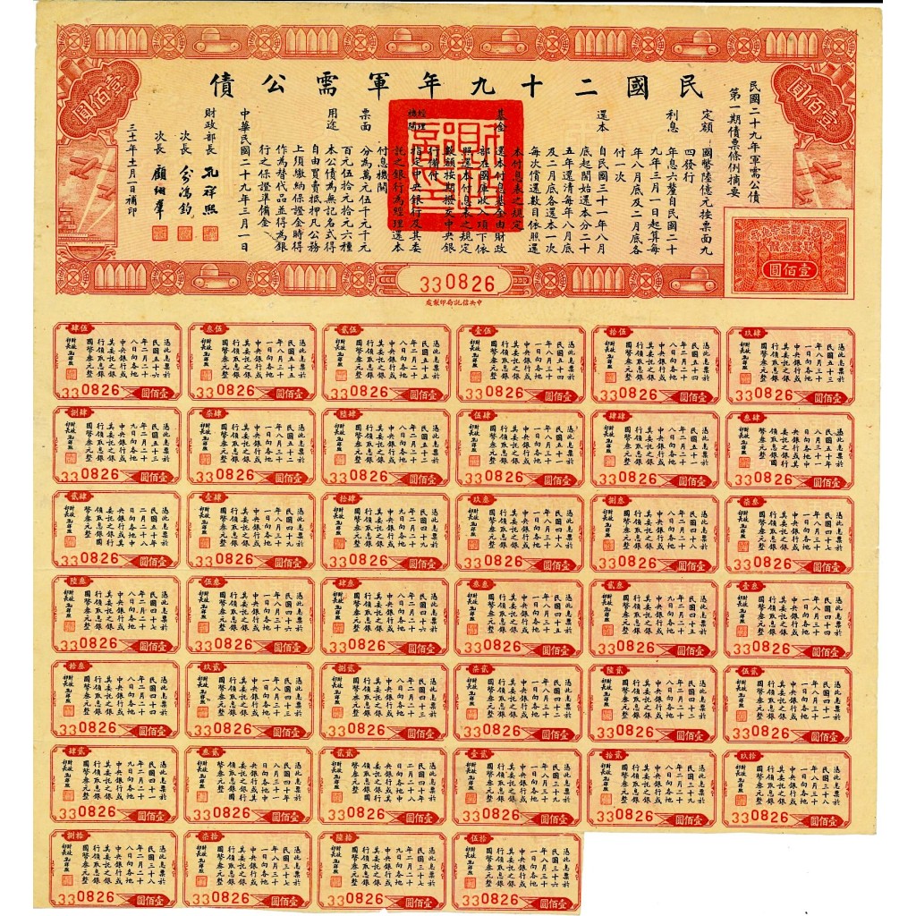 Descrizione Generale: Il documento è un'obbligazione per l'approvvigionamento dell'esercito emessa dal Governo Nazionale della Repubblica di Cina nel 1940. Questa obbligazione ha un valore di $100 e porta un tasso di interesse del 6%.