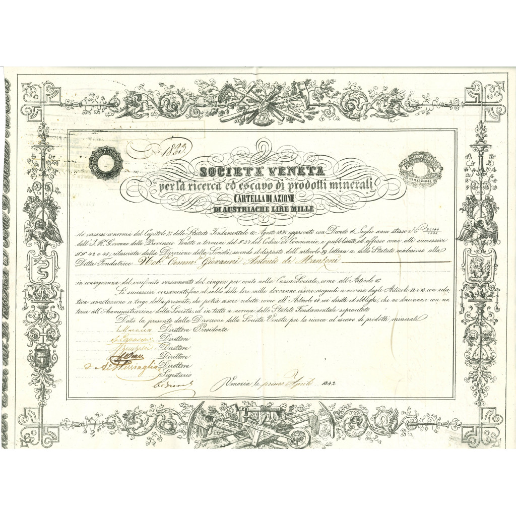 La storia della compagnia fu strettamente connessa alla nascita di progetti ferroviari e alla crescente domanda di carbon fossile per le macchine a vapore nell’industria privata e negli stabilimenti statali. L’attività di ricerca di carbone, torba e lignite nelle province venete rivela chiaramente l’esistenza di un piano consapevole di investimenti per rimuovere l’assoluta dipendenza del Lombardo-Veneto dalla produzione britannica. Concepita da un pool di negozianti, banchieri e industriali - tra cui l’uomo d’affari bavarese Friedrich Christian Oexle (1801-1864), trapiantato stabilmente a Venezia - la società promosse la sottoscrizione di 2.000 azioni da 1.000 Lire austriache ciascuna, ancor prima di ottenere l’autorizzazione governativa nel 1838. L’impresa, nata in un clima di diffuso ottimismo, si mosse rapidamente per ottenere i permessi per i sondaggi in varie località montane del Veneto e del Tirolo, ingaggiando maestranze francesi, prussiane ed austriache. I risultati iniziali furono assai positivi con una produzione di carbon fossile dal 1843 al 1858 di 94.000 tonnellate ed un utile netto dal 1846 al 1854 pari a circa il 20% del capitale investito. Con la nuova ragione sociale di Società Veneta Montanistica, intraprese sondaggi estendendo le ricerche a minerali metalliferi come piombo, mercurio e argento. Tra il 1859 ed il 1862, anni tra i più critici per l’economia veneziana, realizzò nuovi investimenti in Carnia alla ricerca di rame e argento. L’ingente sforzo finanziario non fu però compensato e, nel 1870, la società chiuse il bilancio con un’ingente perdita. Resse tuttavia fino allo scioglimento, avvenuto nel 1897, rappresentando così una delle imprese più longeve fra tutte quelle fondate negli anni Trenta del secolo XIX.