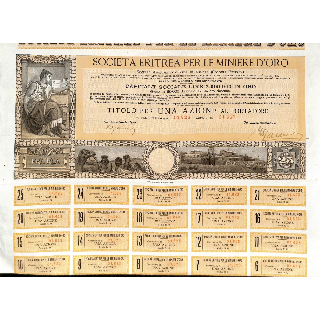 Formato 40x33 cm. Splendido titolo storico minerario della Colonia Italiane in Eritrea. Grafica eccellente con timbro della società, Donna sulla destra con sotto la scritta Eritrea. Immagini storiche dell'oggetto della Società