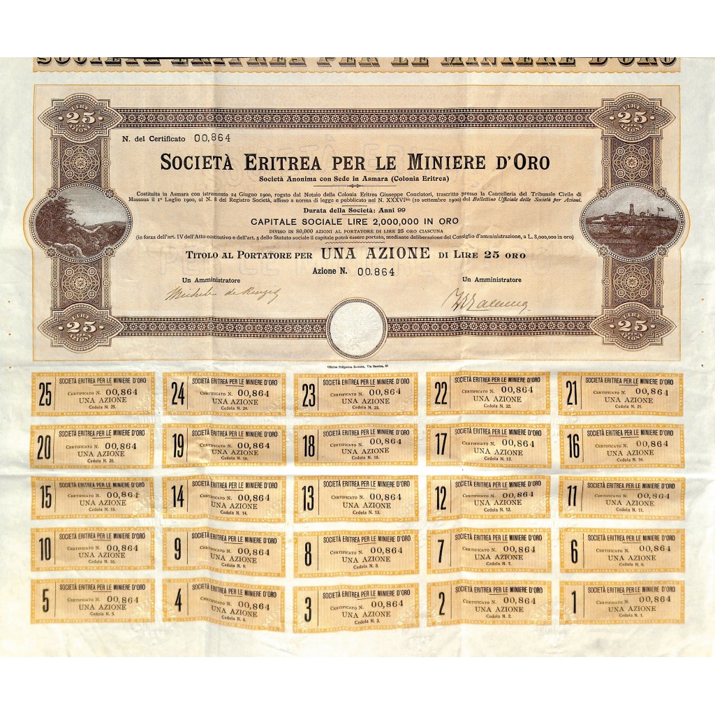 1900 - AZIONE DI FONDAZIONE SOCIETA' ERITREA PER LE MINIERE D`ORO - 1 AZIONE - ASMARA (COLONIA ERITREA)