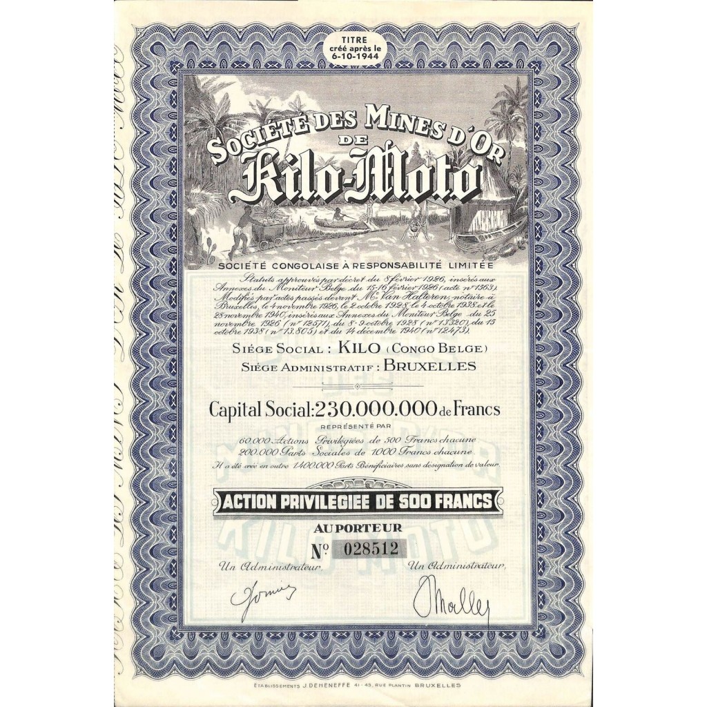 1944 - MINES D'OR DE KILO-MOTO SOC. DES - ACTION PRIVIL.