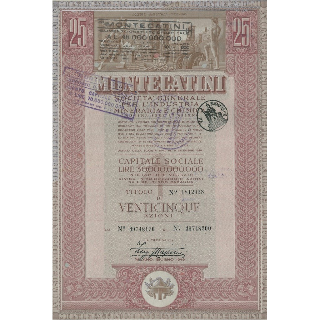In vendita un pregevole certificato azionario della Montecatini, storica società industriale italiana attiva nel settore minerario e chimico. Il certificato rappresenta 25 azioni ed è stato emesso a Milano nel giugno 1949.