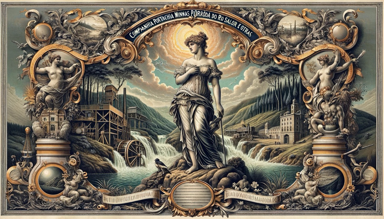 L'immagine ispirata alla storia della Companhia Portugueza das Minas do Rio Salôr e Outras. La scena rappresenta una figura allegorica femminile che simboleggia la ricchezza mineraria e la prosperità, con paesaggi lussureggianti e attrezzature minerarie in secondo piano. Lo stile richiama i certificati del XIX secolo, con motivi floreali e classici, catturando l'essenza delle attività minerarie storiche.