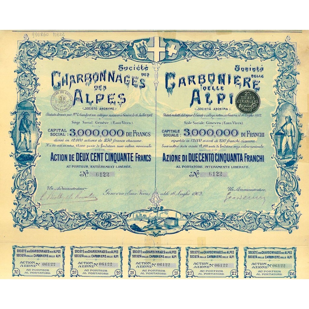 Titolo di una azione al portatore del valore di 250 Franchi.
