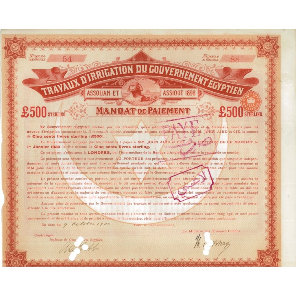 Il Governo Egiziano ha intrapreso grandi progetti di irrigazione alla fine del XIX secolo per migliorare l’agricoltura e gestire le risorse idriche del Nilo. Tra questi, i lavori di irrigazione ad Assouan e Assiout erano cruciali per il controllo delle inondazioni e per l’irrigazione delle terre agricole. Il progetto di Assouan è particolarmente noto per la costruzione della prima diga di Assuan, che ha segnato un’importante svolta nella gestione delle acque del Nilo e nello sviluppo agricolo dell’Egitto. Il mandato di pagamento riflette l’impegno del Governo Egiziano a finanziare questi lavori attraverso obbligazioni a lungo termine, garantendo così la realizzazione di infrastrutture vitali per il paese.