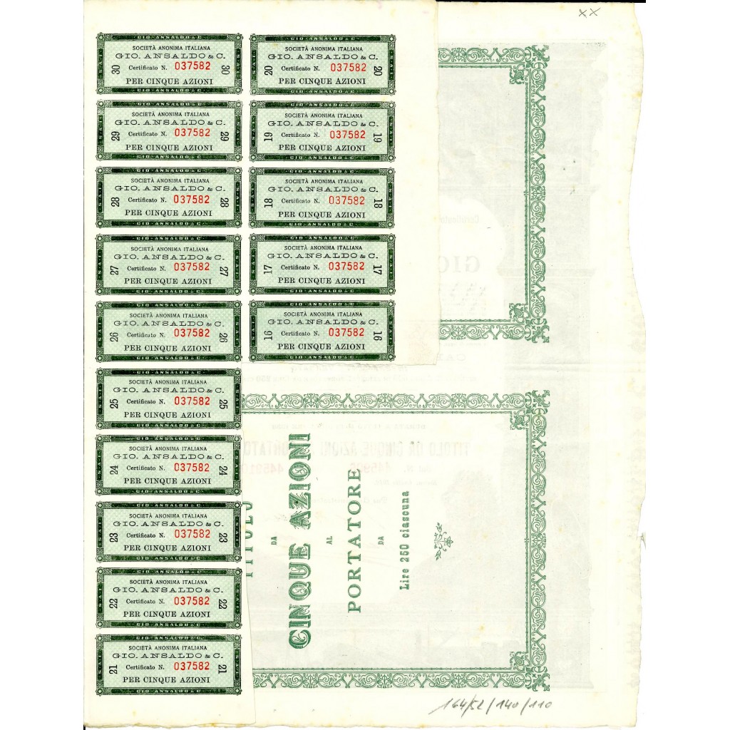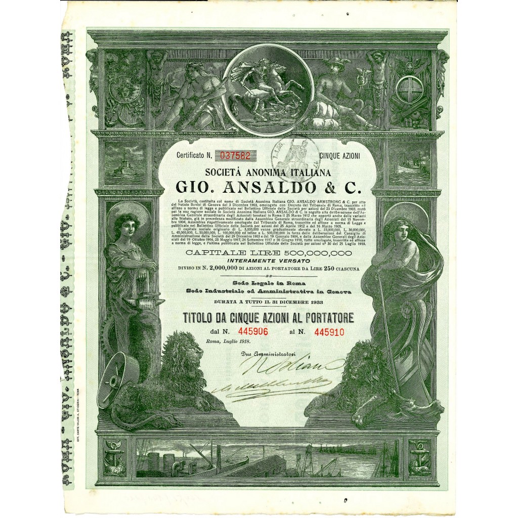 Nel 1914 il capitale sociale è di 30 milioni di lire, nel 1918 arriva a 500 milioni di lire, grazie ai ricavi ottenuti dalla produzione del 46% di tutta l'artiglieria costruita in Italia durante la guerra, 3 000 aerei, 1 574 motori aeronautici, 96 navi da guerra, 200 000 t di naviglio mercantile e 10 milioni di munizioni.