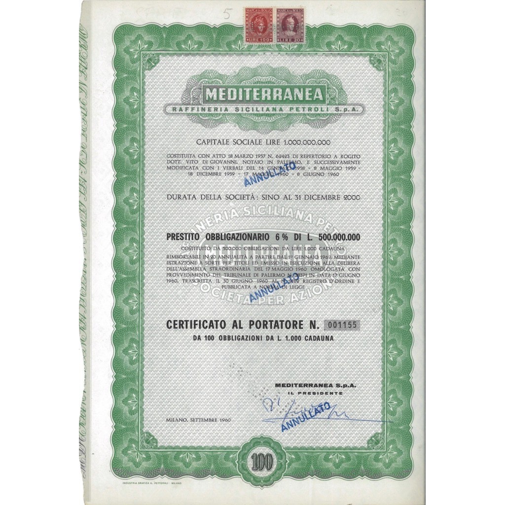 La Mediterranea Raffineria Siciliana Petroli S.p.A., costituita con atto del 18 marzo 1957 a Palermo, rappresentava una delle più ambiziose iniziative industriali siciliane legate al settore energetico e petrolifero. Il capitale sociale, pari a 1 miliardo di lire, riflette l'entità dell'investimento e l'importanza strategica del progetto.