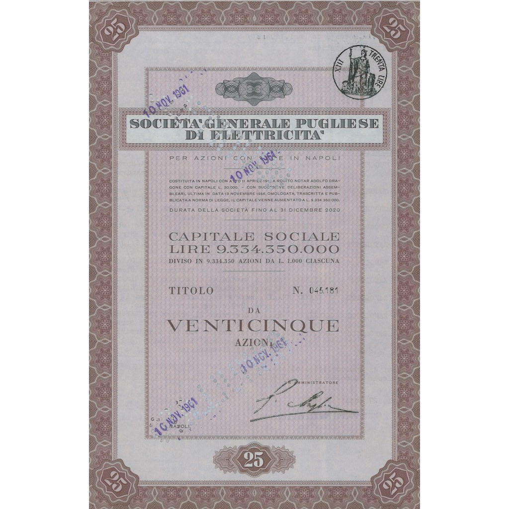 L’elettrificazione della Puglia ebbe inizio nel 1925, quando la Società Meridionale di Elettricità (SME) e la sua consociata Società Generale Pugliese di Elettricità misero in funzione una linea ad alta tensione in grado di collegare gli impianti del Matese con la Puglia, in modo da avviare una distribuzione diretta di energia idroelettrica nelle province di Bari e Foggia. Fino ad allora la produzione di energia elettrica era affidata a modesti impianti termoelettrici di piccole società distributrici e di aziende municipalizzate.
