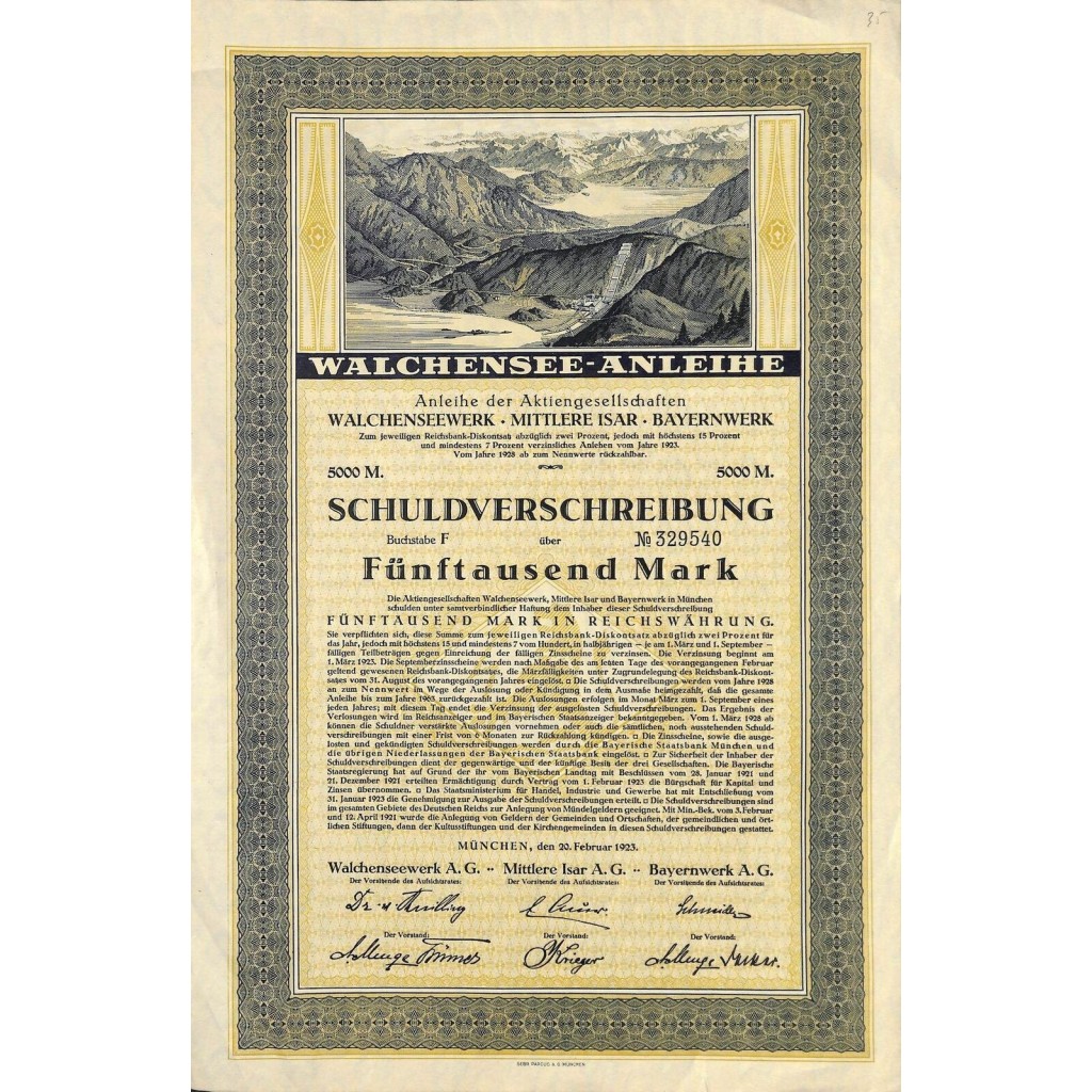 Il documento presenta le firme dei rappresentanti autorizzati di Walchenseewerk A.G., Mittlere Isar A.G. e Bayernwerk A.G., garantendo la sua autenticità e validità legale. Il design intricato e l'incisione dettagliata sottolineano l'importanza di questo strumento finanziario durante il suo tempo.