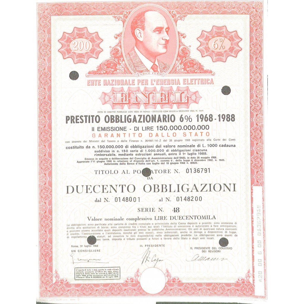 1968 - ENEL (ENRICO FERMI) 200 OBBLIGAZIONI 6% 1968-1988 - ROMA