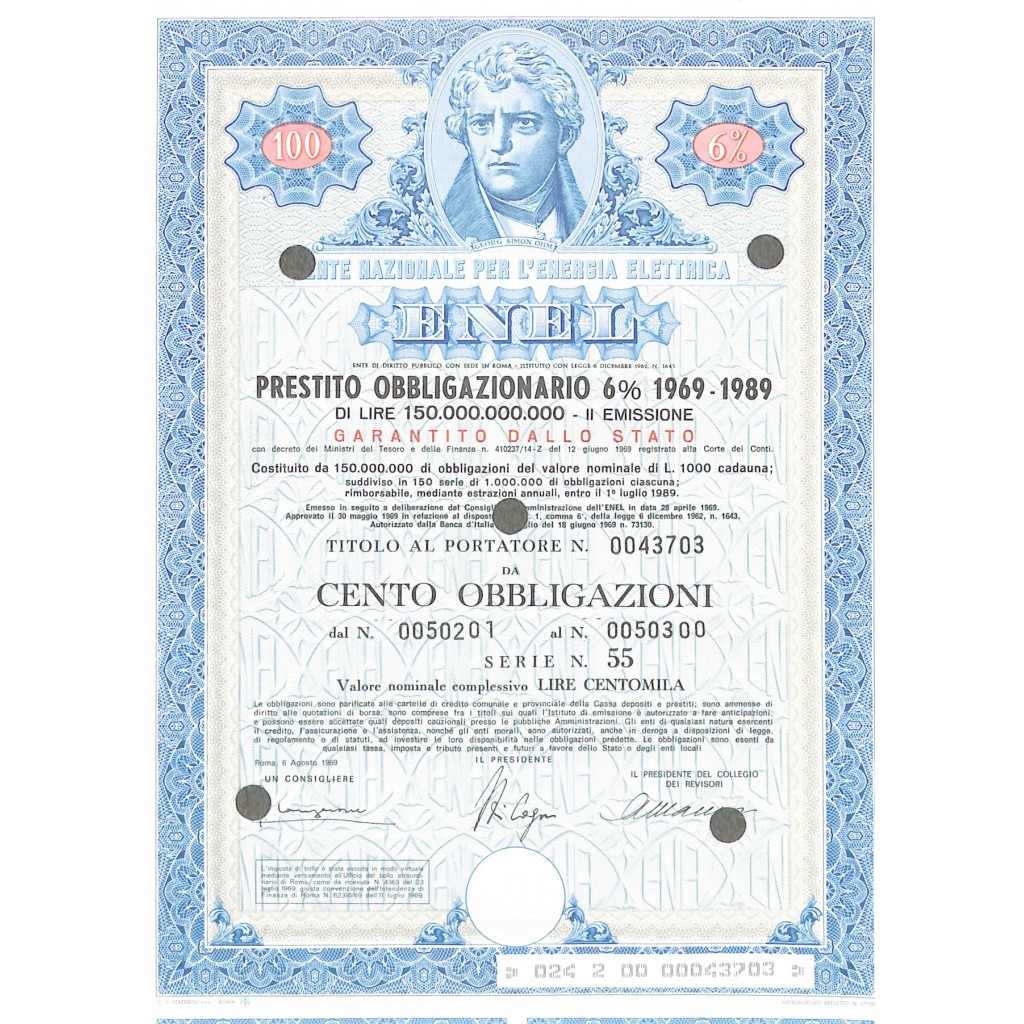 1969 - ENEL (GEORGE SIMON OHM) 100 OBBLIGAZIONI 6% 1969-1989 - ROMA
