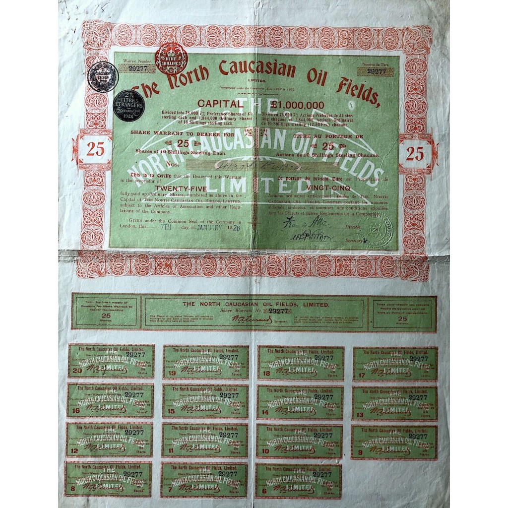 Titolo di 25 azioni al portatore del valore di 10 Sterline.