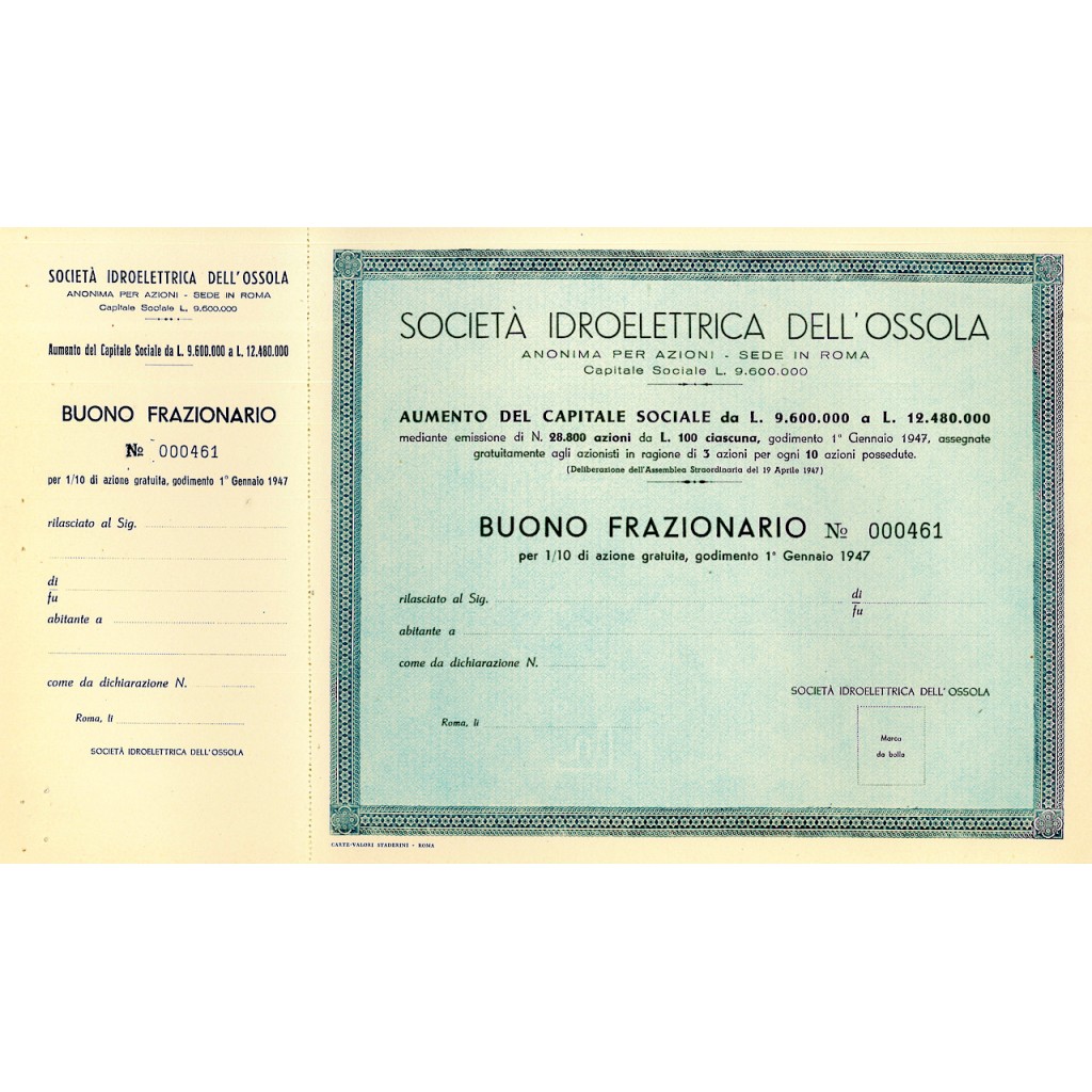 1947 - SOCIETA' IDROELETTRICA DELL'OSSOLA - BUONO FRAZIONARIO - ROMA