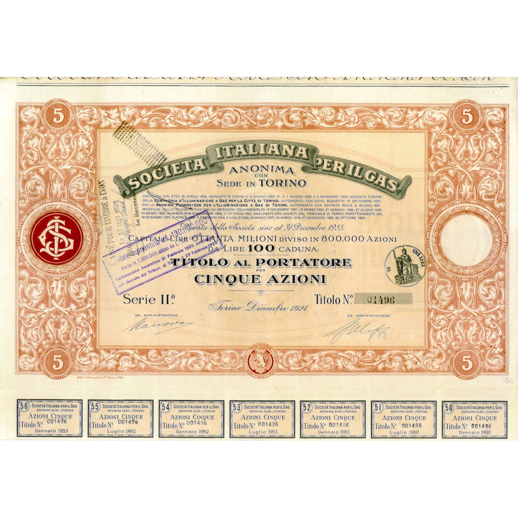 1924 - ITALIANA PER IL GAS - 5 AZIONI - TORINO