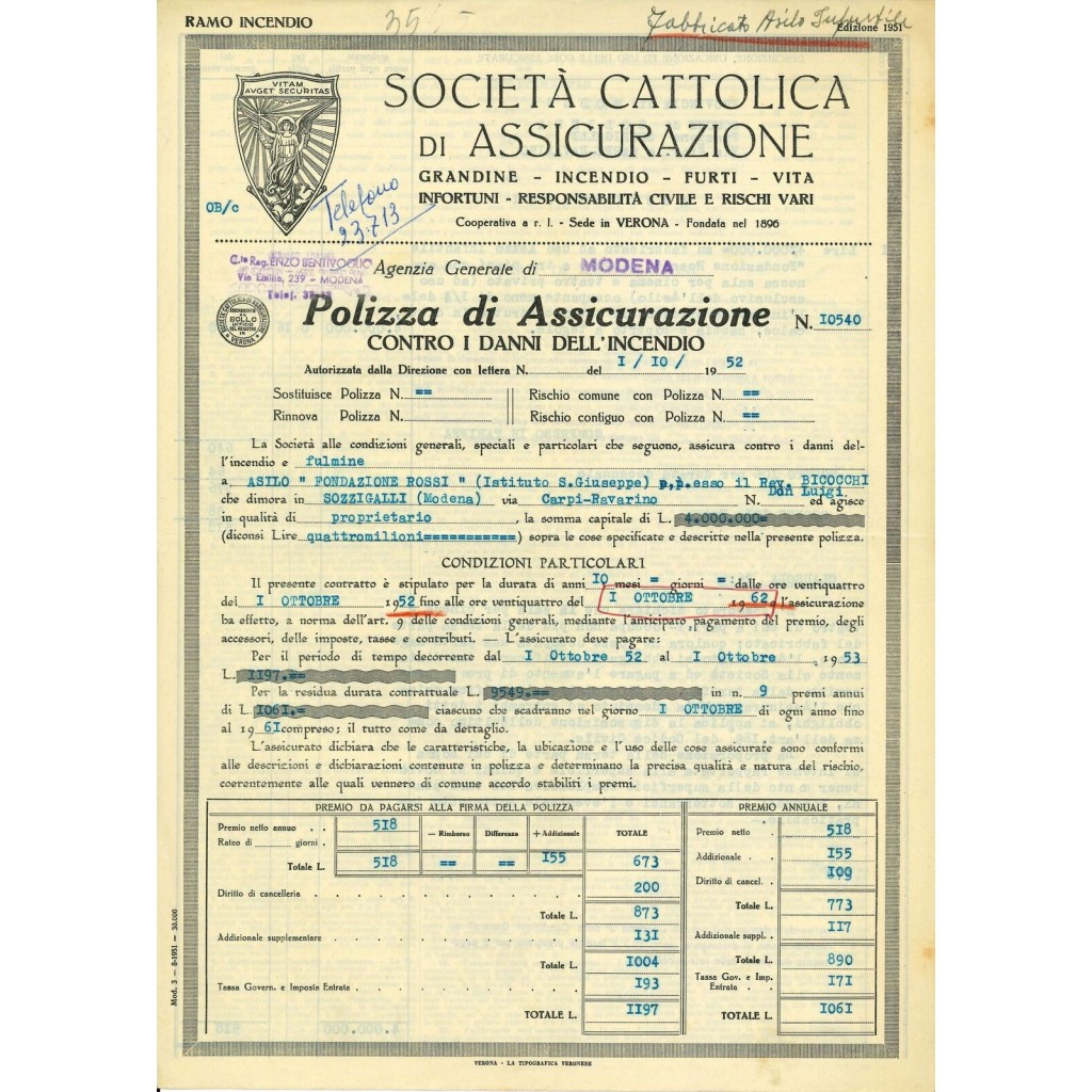 1952 - SOCIETA' CATTOLICA DI ASSICURAZIONE - INCENDIO - MODENA