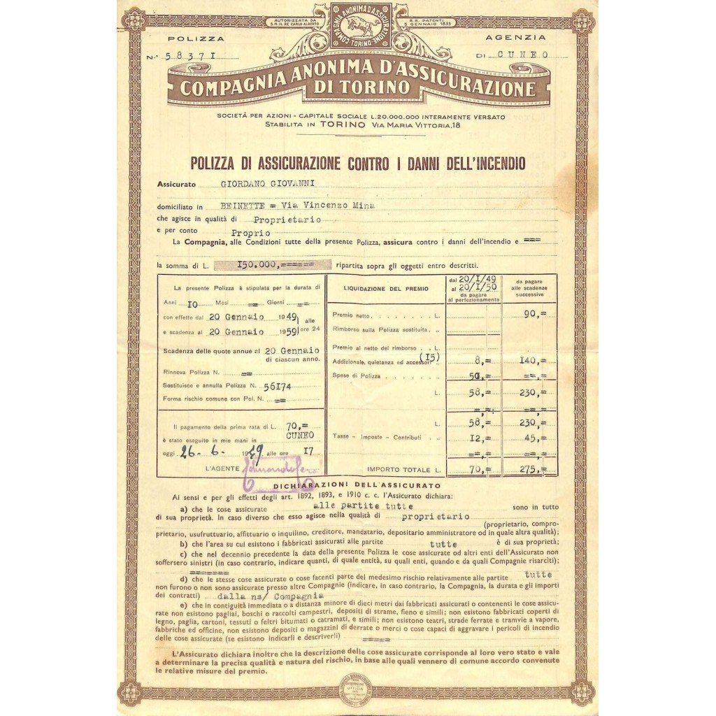 1949 - COMPAGNIA ANONIMA D'ASSICURAZIONE DI TORINO - POLIZZA DI ASS. CONTRO I DANNI DELL'INCENDIO