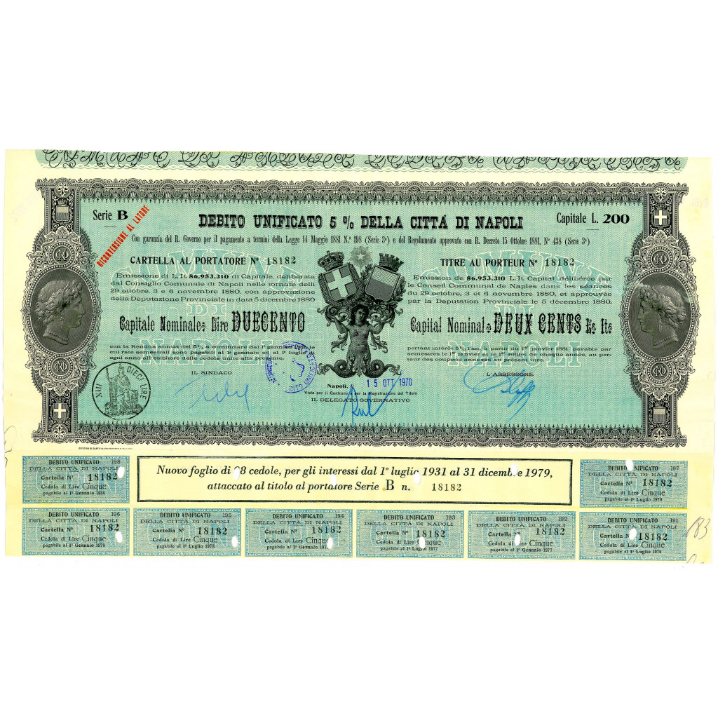 Emissione di L. It. 86,953,310 di Capitale, deliberata dal Consiglio Comunale di Napoli nelle tornate del 29 ottobre, 3 e 6 novembre 1880 con approvazione della Deputazione Provinciale in data 5 dicembre 1880. Capitali Nominativi da 100 / 200 / 500 e 1.000 Lire. Con la Rendita annua del 5% a cominciare dal 1 gennaio 1881, le cui rate semestrali sono pagabili al 1 gennaio ed al 1 luglio di ogni anno all’esibire delle cedole unite alla presente. Riporta le firme in originale del Sindaco, dell’assessore e del Delegato Governativo.