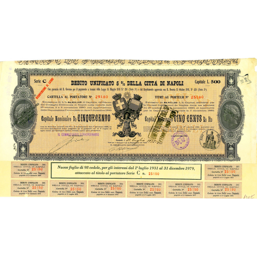 Emissione di L. It. 86,953,310 di Capitale, deliberata dal Consiglio Comunale di Napoli nelle tornate del 29 ottobre, 3 e 6 novembre 1880 con approvazione della Deputazione Provinciale in data 5 dicembre 1880. Capitali Nominativi da 100 / 200 / 500 e 1.000 Lire. Con la Rendita annua del 5% a cominciare dal 1 gennaio 1881, le cui rate semestrali sono pagabili al 1 gennaio ed al 1 luglio di ogni anno all’esibire delle cedole unite alla presente. Riporta le firme in originale del Sindaco, dell’assessore e del Delegato Governativo.