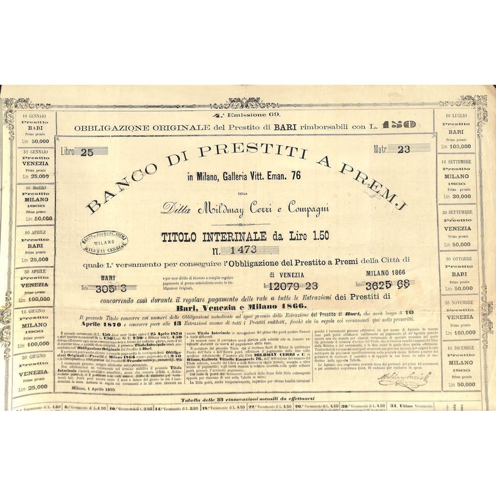 UNA OBBLIGAZIONE BANCO PRESTITI A PREMJ DI BARI PER LA DITTA MILDMAY CERRI E COMPAGNI