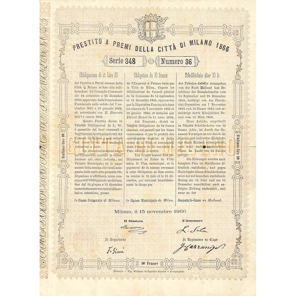 1866 - PRESTITO A PREMI DELLA CITTA' DI MILANO 1 OBBLIGAZIONE