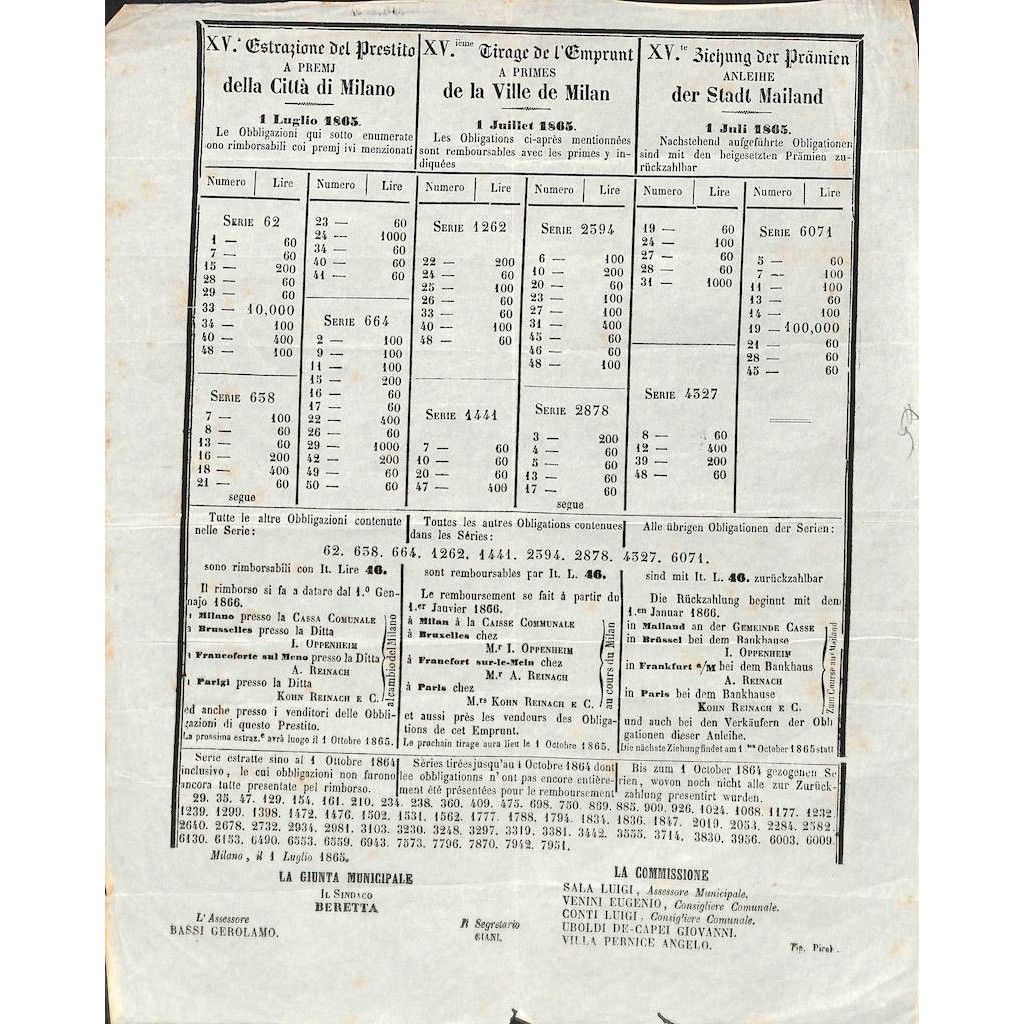 VOLANTINO PER XV ESTRAZIONE DEL PRESTITO A PREMJ DELLA CITTA' DI MILANO - 1865