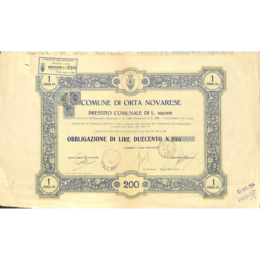 Questa rara obbligazione del Comune di Orta Novarese fu emessa nel 1928 per finanziare la costruzione dell’acquedotto municipale, un’opera infrastrutturale fondamentale per lo sviluppo igienico e civile della comunità locale. Con un interesse lordo annuo del 6%, il prestito fu deliberato dalle autorità prefettizie e amministrative dell’epoca. Stampata con eleganza e corredata da marche da bollo e timbri, la cedola testimonia il coinvolgimento diretto dei piccoli comuni italiani nell’attuazione delle opere pubbliche durante il ventennio fascista, in linea con le politiche di modernizzazione promosse a livello nazionale. Il titolo, oggi ricercato dai collezionisti, è un vivido esempio di finanza pubblica locale dell’Italia tra le due guerre.
