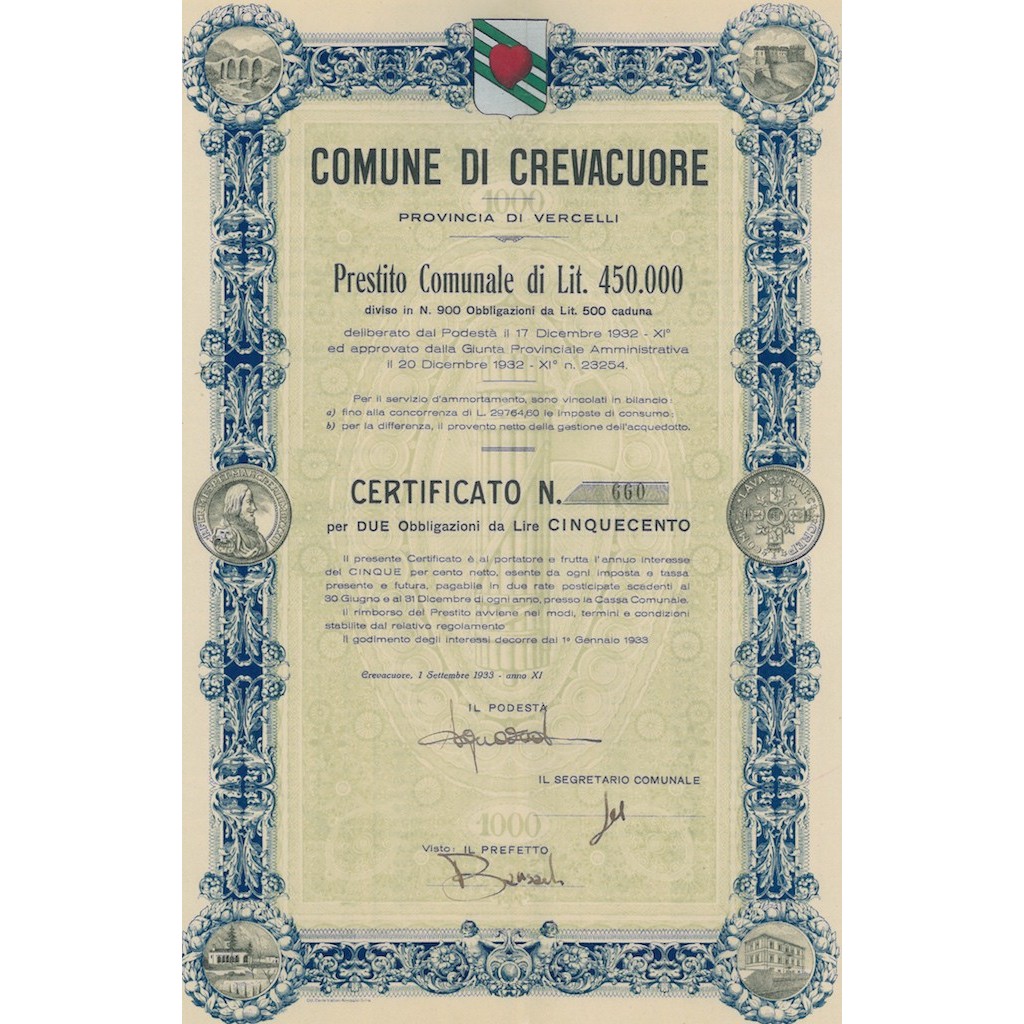 CERTIFICATO PER DUE OBBLIGAZIONI DA LIRE 500