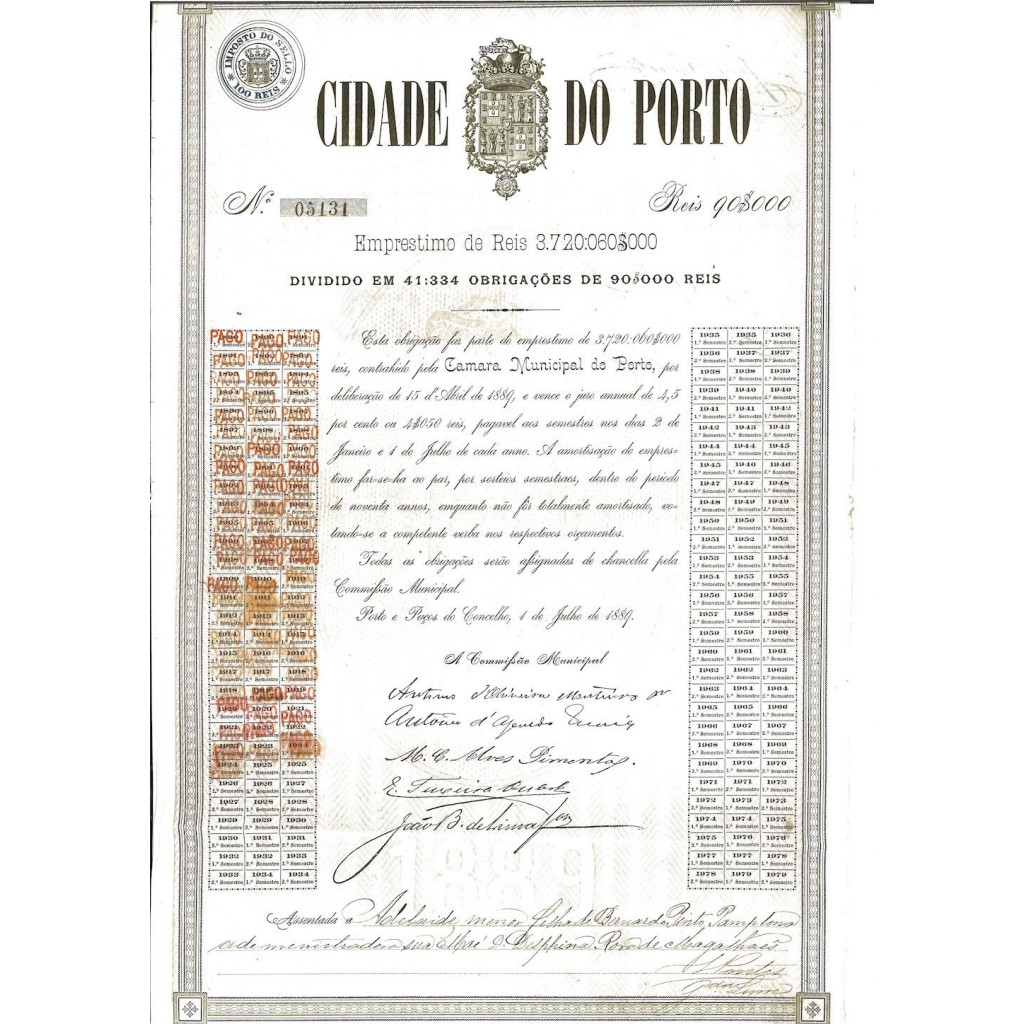 Questo certificato di obbligazione storica, emesso nel 1889, rappresenta un prestito di 3.720.060.000 Reis, suddiviso in 41.334 obbligazioni di 905.000 Reis ciascuna. Il bond presenta dettagli intricati, tipici dei documenti finanziari del XIX secolo, inclusi il sigillo ufficiale di Porto e bordi ornati. L'obbligazione è stata emessa come parte di un'iniziativa di finanziamento pubblico su larga scala per supportare i progetti municipali a Porto durante la fine del XIX secolo. Questo periodo è stato caratterizzato da significativi sforzi di sviluppo urbano e modernizzazione della città.