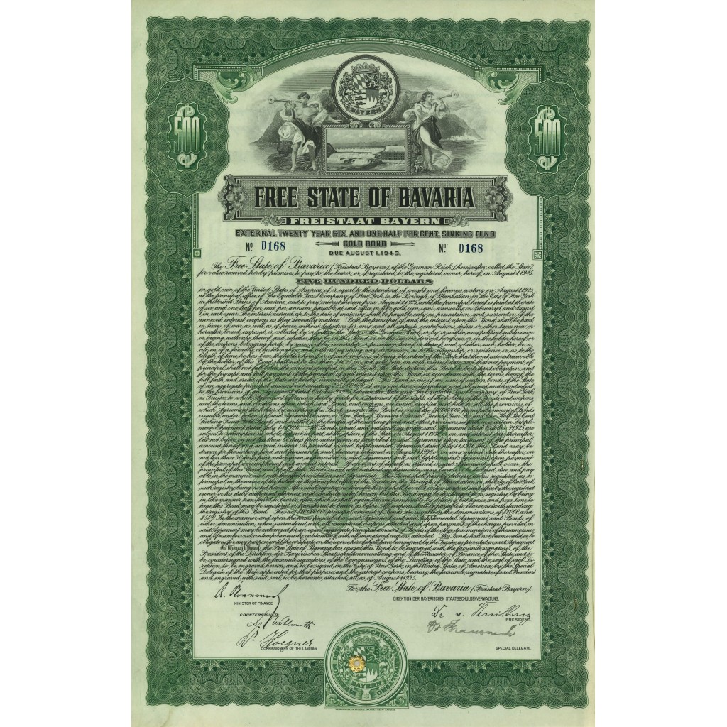 La Free State of Bavaria (Freistaat Bayern), fondata nel 1919, è stata una delle entità più significative nella storia economica e politica della Germania post-bellica. Con una forte tradizione di autonomia e autogoverno, la Baviera ha giocato un ruolo cruciale nello sviluppo della Germania moderna. Questo documento rappresenta un'obbligazione emessa dallo Stato Libero di Baviera nel periodo post-bellico per finanziare la ricostruzione e lo sviluppo economico della regione.