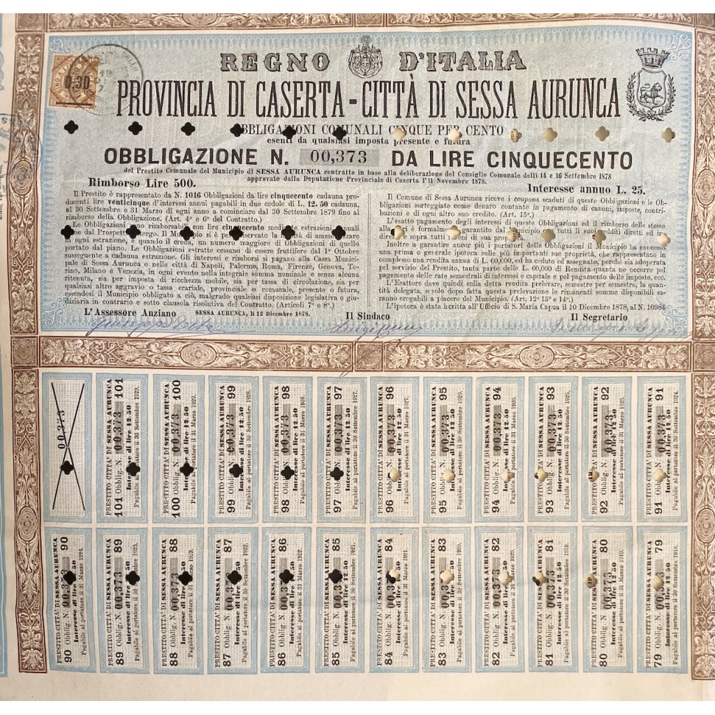 1878 - PROVINCIA DI CASERTA - CITTA' DI SESSA AURUNCA 1 OBBLIGAZIONE