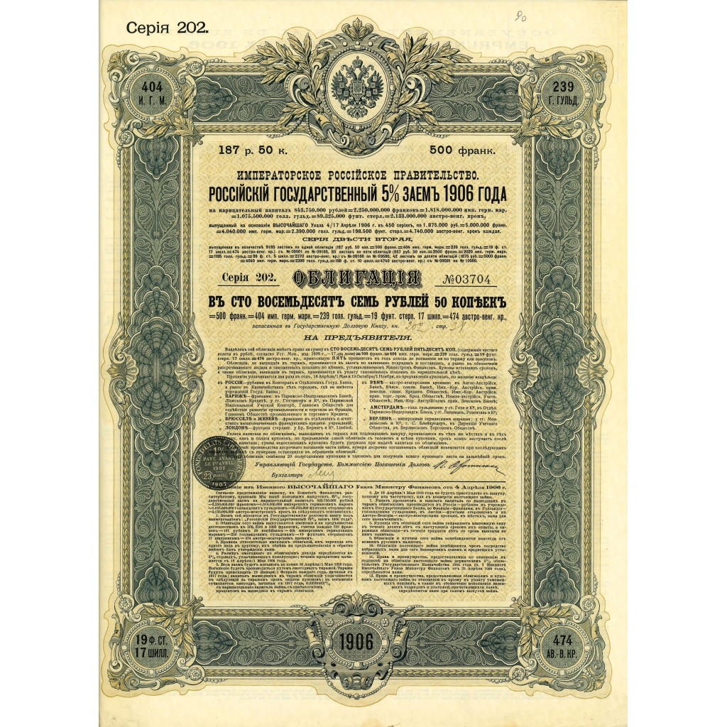 Il "Gouvernement Impérial de Russie - Emprunt de l'État Russe 5% 1906" rappresenta un'importante emissione obbligazionaria del governo imperiale russo. Questa emissione è stata effettuata per finanziare vari progetti governativi e infrastrutturali durante un periodo di significativa crescita economica e modernizzazione nell'Impero Russo. Emesso nel 1906, questo prestito statale ha giocato un ruolo cruciale nella raccolta di capitali necessari per sostenere le ambizioni economiche dell'epoca.