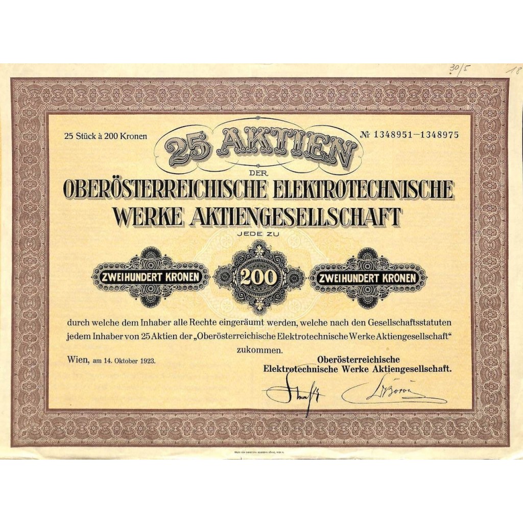 Certificato di 25 azioni del valore di 200 corone.