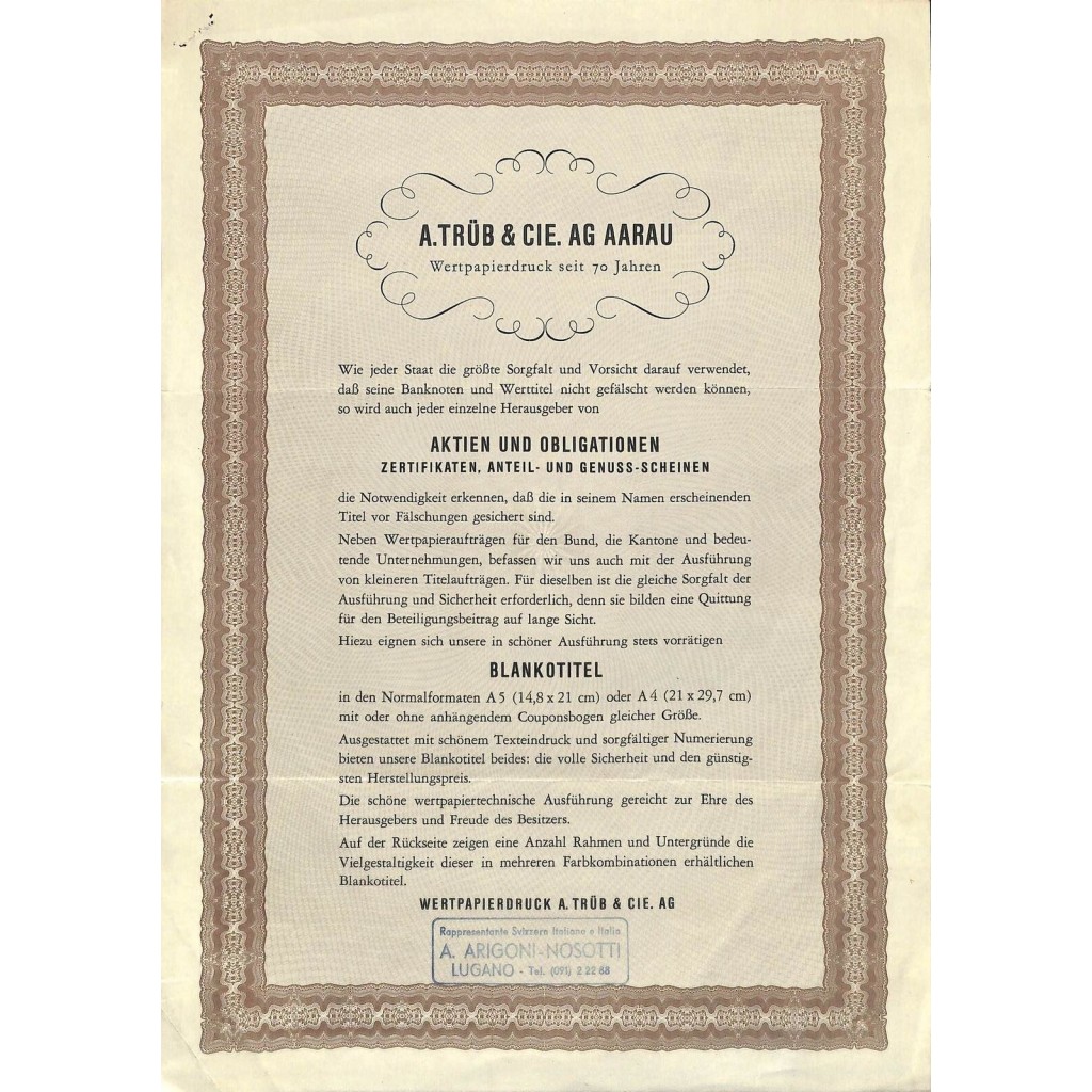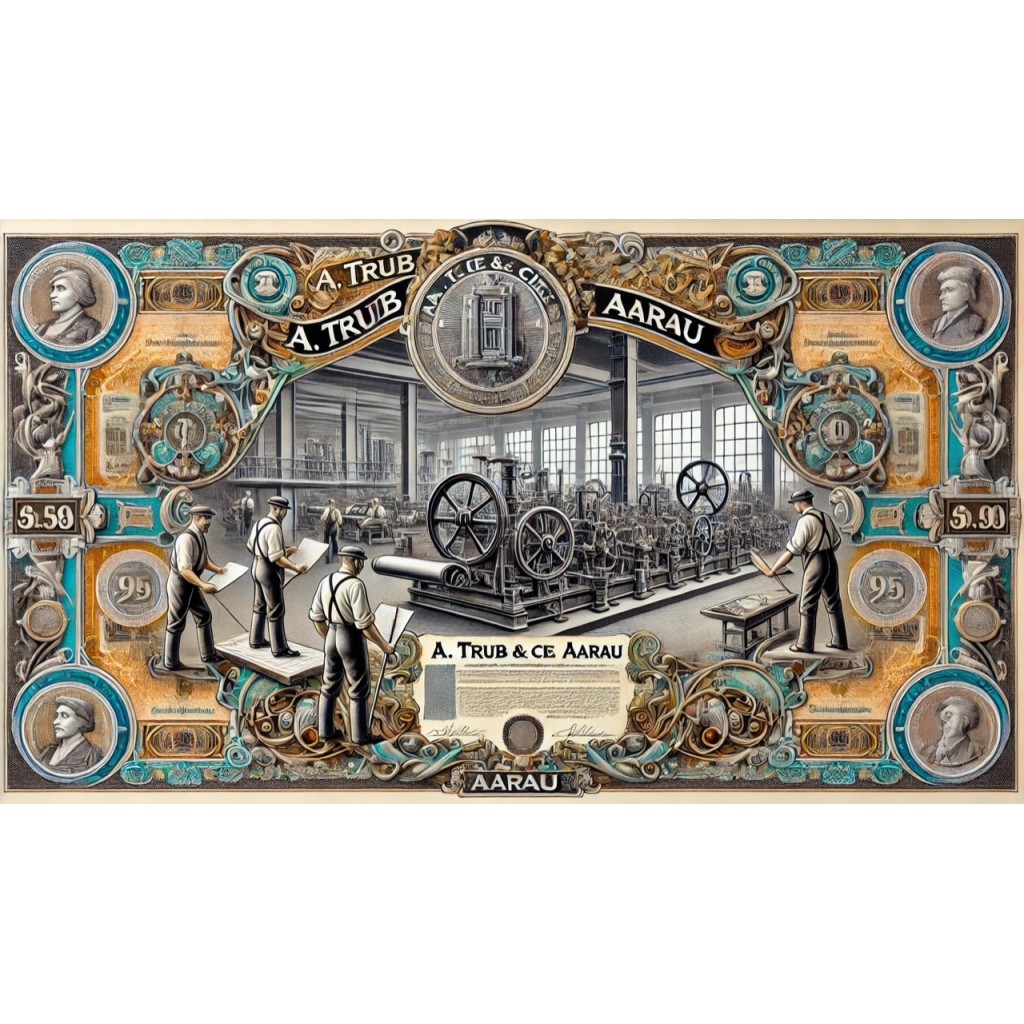Fondata nel XIX secolo, A. Trüb & Cie. AG Aarau si è affermata come uno dei principali produttori di documenti di valore in Svizzera. La sua sede, situata nella città di Aarau, è diventata un punto di riferimento per la produzione di titoli di sicurezza. Con oltre 70 anni di esperienza al momento dell'emissione di questo documento, l'azienda ha contribuito in modo significativo a garantire l'integrità e l'affidabilità dei titoli finanziari svizzeri.