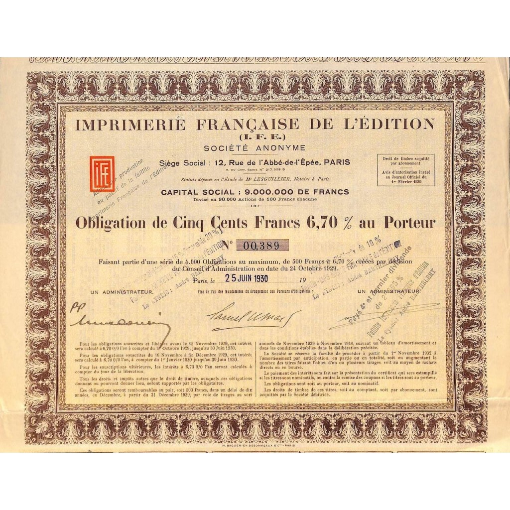 Titolo obbligazionario al portatore 6,70% del valore di 500 Franchi.