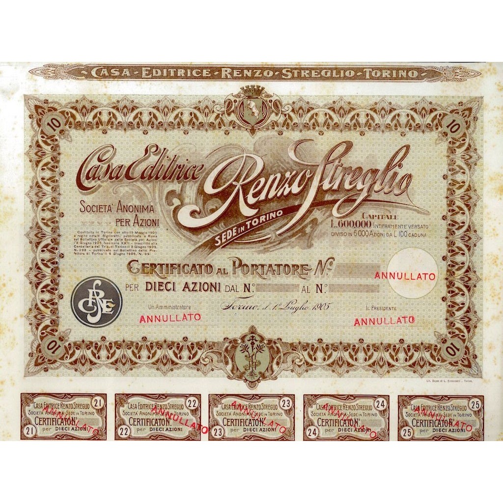 Certificato al portatore per 10 azioni del valore di Lire 100 cadauna.
