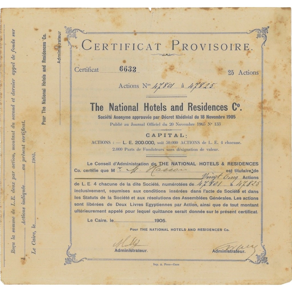 Il certificato fu emesso nel 1905, un periodo in cui l'Egitto stava diventando una delle principali destinazioni turistiche grazie al fascino delle sue antichità e al clima invernale mite. La The National Hotels and Residences Co. si inseriva in questo contesto di crescente interesse internazionale, con l'obiettivo di fornire strutture ricettive di alto livello per i visitatori stranieri. L'incremento del turismo era alimentato anche dalla costruzione di infrastrutture come ferrovie e porti, che facilitavano l'accesso ai luoghi più emblematici del paese.